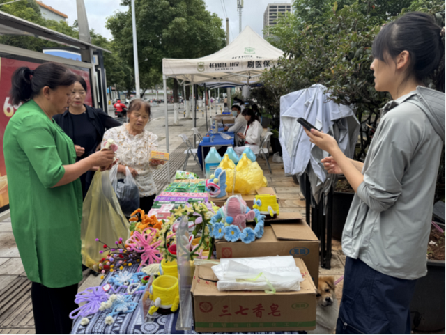 市集当天,义卖摊位前人来人往,不时有行人停下驻足了解助残义卖品。返乡大学生热情地向过往居民介绍每一件手工制品背后的故事,讲述残疾人士制作时的坚持与不易,以真诚的态度和详细的讲解深深打动了居民。
