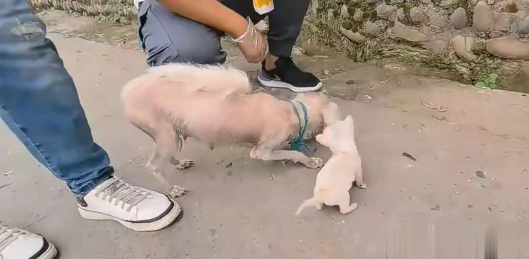 不过,没过多久狗妈妈出来了,小奶狗晃动着圆滚滚的小身子也跑了出来,那明亮的小眼神瞬间暖化了小哥。小奶狗不停地舔着小哥,仿佛把他当成了自己的妈妈。救援小哥随后将狗狗母子送到了宠物医院,医生为狗妈妈做了全面检查。由于长期在山上流浪,环境潮湿,狗妈妈身上多处患有皮肤病,这也是它毛发脱落的主要原因。之后,狗妈妈被小哥送到了动物救助基地。